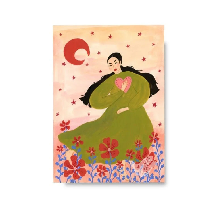 Soms heb je maar één zachte reminder nodig om weer even stil te staan bij jezelf. Deze liefdevolle ansichtkaart laat precies dat voelen. De vrouw op de illustratie houdt haar eigen hart vast, midden in een veld van bloemen onder een rustige hemel. Een klein beeld dat veel zegt: je mag vertragen, je mag ademen, je mag zachter zijn voor jezelf.