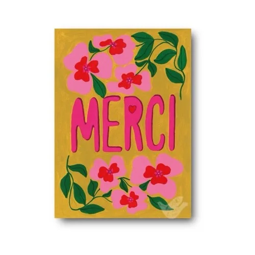Zeg merci met kleur en warmte! De Merci Ansichtkaart is een vrolijke en expressieve bedankkaart vol leven. Tussen roze en rode bloemen schittert het speelse roze ‘Merci’ op een diepe okergele achtergrond — een kaart die direct een glimlach oproept.