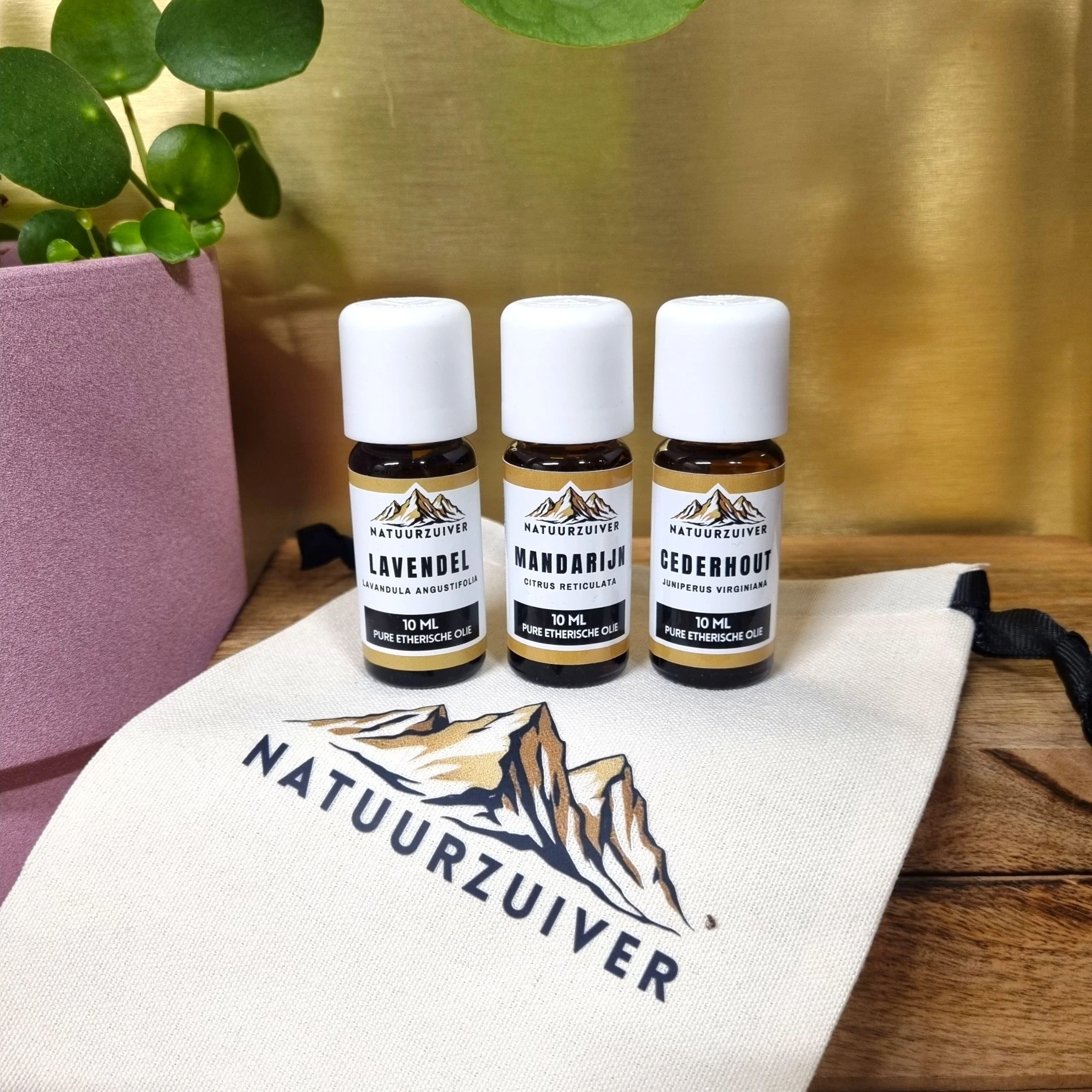 De Najaarsrust diffuserblend brengt zachtheid en ontspanning in je avond. De kalmerende rust van Lavendel, de zonnige vrolijkheid van Mandarijn en de aardse diepte van Cederhout vormen samen een geur die je helpt om de dag rustig af te sluiten. De basisset bestaat uit drie losse flesjes van 10 ml, zodat je zelf eenvoudig de blend kunt samenstellen in je diffuser. Als extra krijg je er een luxe canvas bewaarzak bij, bedrukt met het Natuurzuiver-logo. Zo kun je je oliën netjes en stijlvol bewaren.