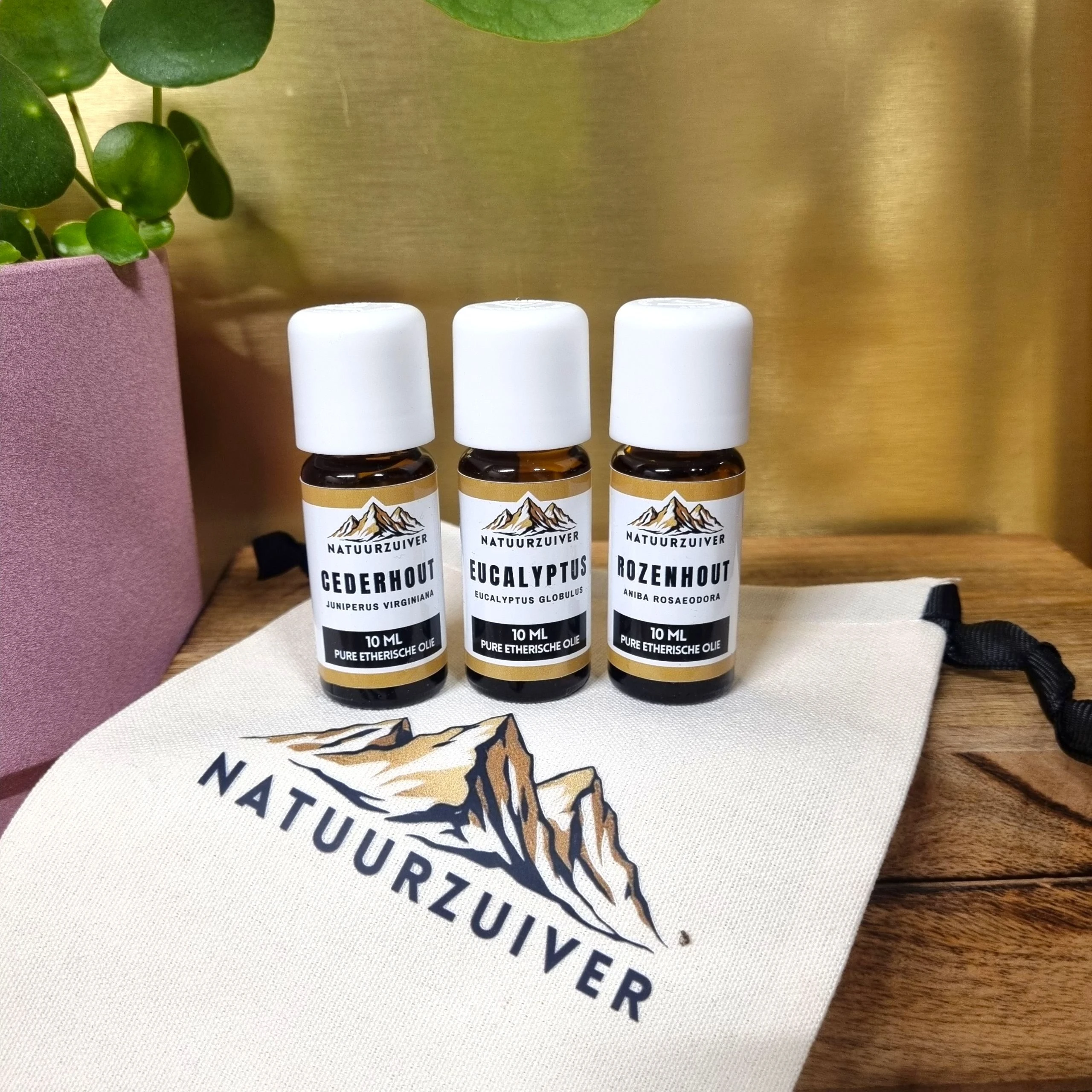 De basisset bestaat uit drie losse flesjes van 10 ml, zodat je zelf eenvoudig de blend kunt samenstellen in je diffuser. Als extra krijg je er een luxe canvas bewaarzak bij, bedrukt met het Natuurzuiver-logo. Zo kun je je oliën netjes en stijlvol bewaren.