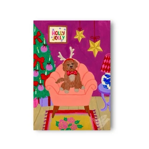 Vrolijke dubbele kerstkaart met een schattige labradoodle in kerstoutfit. De illustraties zijn met de hand geschilderd door de Nederlandse Illustratrice Kirsten Blom. De binnenkant van de kaart is roze en heeft een kerstboom illustratie aan de linkerzijde.