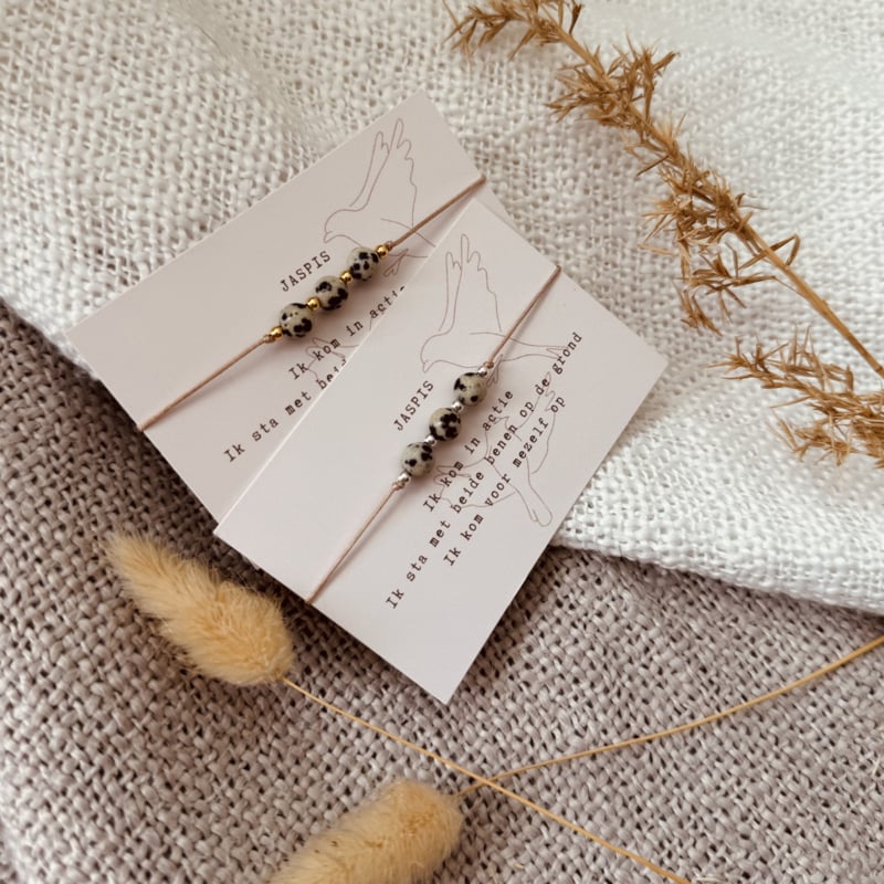 Een licht en speels armbandje dat je helpt om het leven weer wat zachter te bekijken. De gespikkelde Dalmatiër Jaspis nodigt uit om spanning los te laten, vrolijker te voelen en met beide voeten op de grond te blijven. Handgemaakt door Typisch Shanna, subtiel op beige satijnkoord en verfijnd met kleine goudkleurige of zilverkleurige kraaltjes.