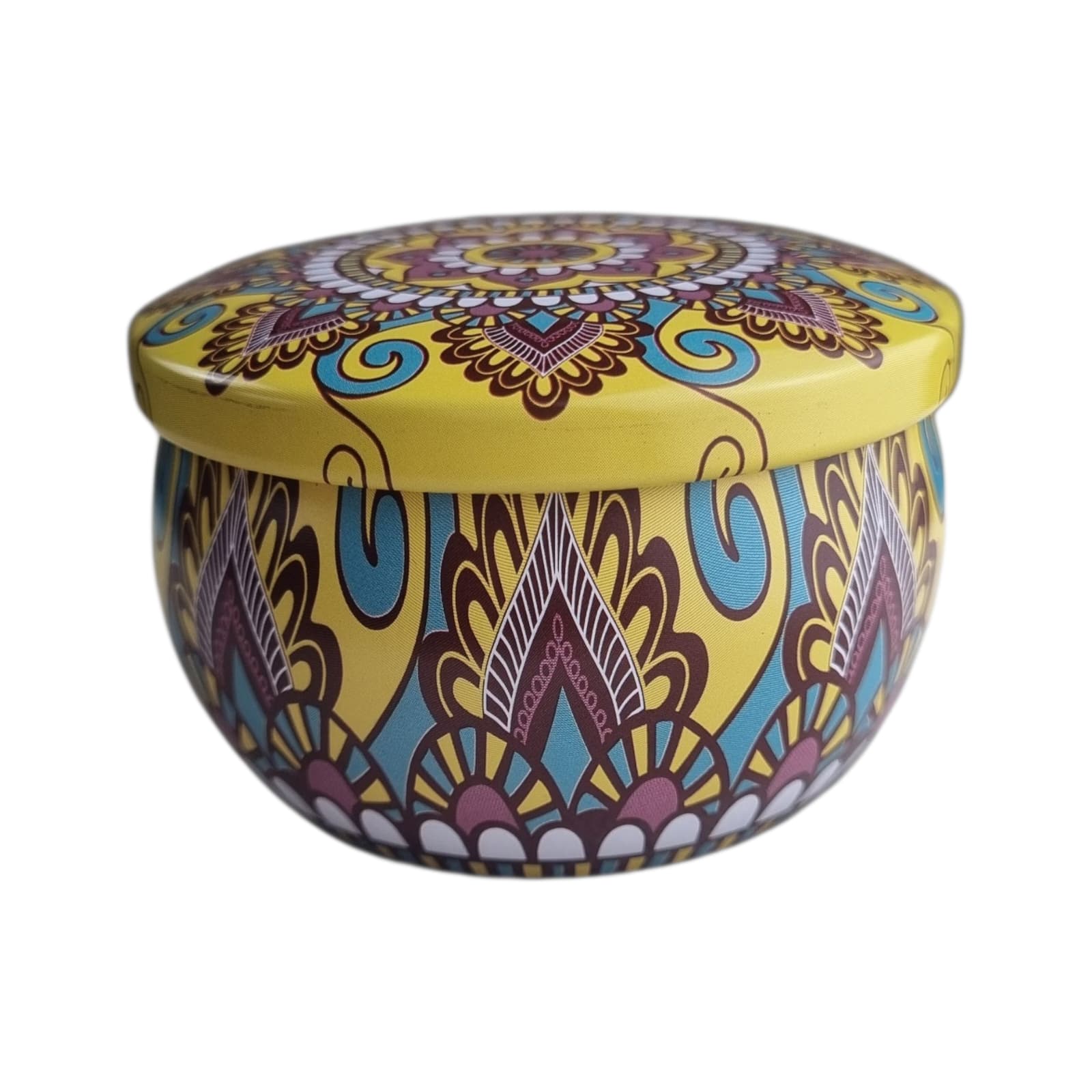 Met zijn zonnige gele achtergrond en rijke mandala in paars, turquoise en bruin straalt dit potje warmte en levendigheid uit. Het bloemvormige patroon geeft een vrolijke en speelse uitstraling, waardoor het prachtig past op een eettafel of in de woonkamer. Het potje is gevuld met Natuurzuiver Himalayazout granulaat.
